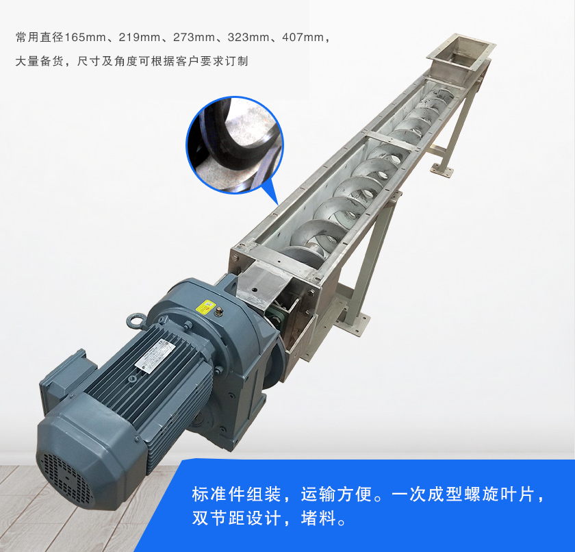 粉煤灰螺旋輸送機(jī)常用直徑有165mm、219mm、273mm、323mm、407mm,可選萬向球連接以及軟布袋連接兩種連接方式,使安裝調(diào)節(jié)轉(zhuǎn)向方便,連接更嚴(yán)密。密封性好,能防止粉塵污染,可根據(jù)用戶輸送工藝水平或傾斜輸送,組合靈活,可與多種設(shè)備配套使用。