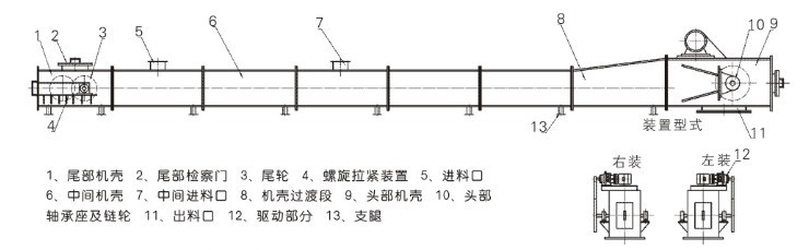 機尾:由機尾架、尾輪組、張緊裝置組成,前部用法蘭與中間槽聯(lián)接,通過調(diào)節(jié)尾部的張緊裝置拉緊尾輪組軸承座,可以調(diào)節(jié)鏈條的張緊程度。