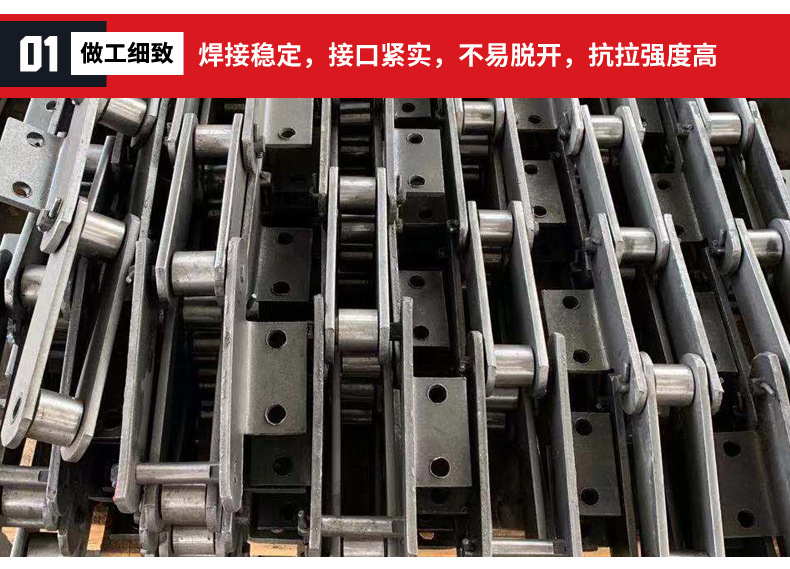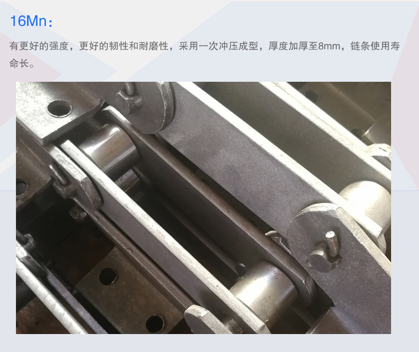 16Mn:有更好的強(qiáng)度,更好的韌性和耐磨性,采用一次沖壓成型,厚度加厚至8mm,鏈條使用壽命長(zhǎng)。