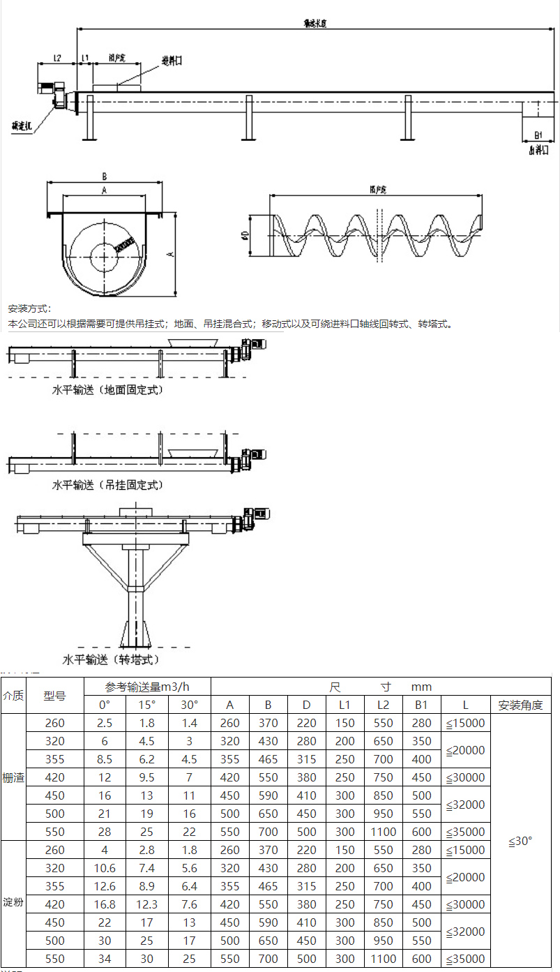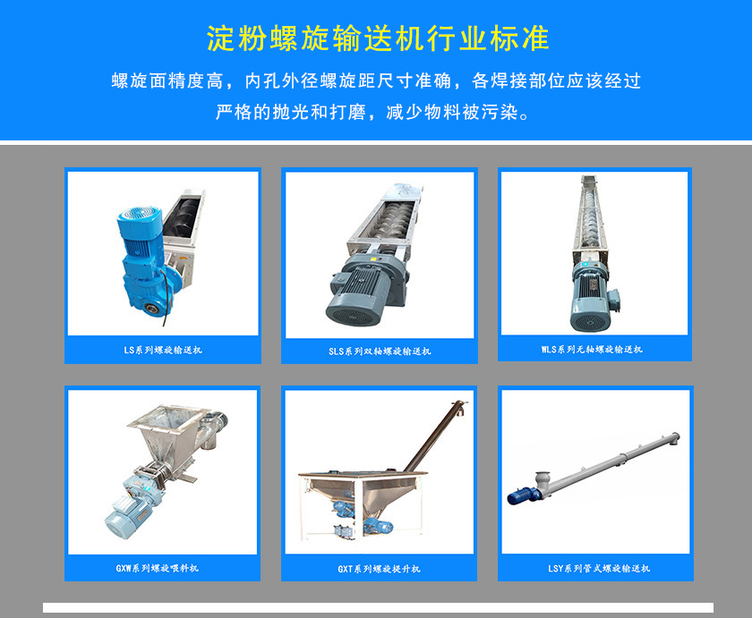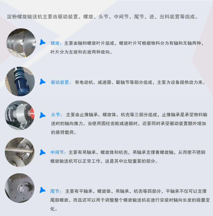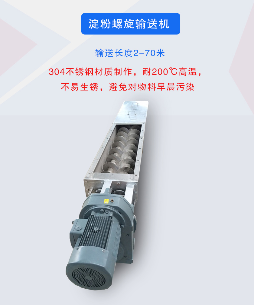 淀粉螺旋輸送機主要由驅動裝置、螺旋、頭節(jié)、中間節(jié)、尾節(jié)、進、出料裝置等組成。