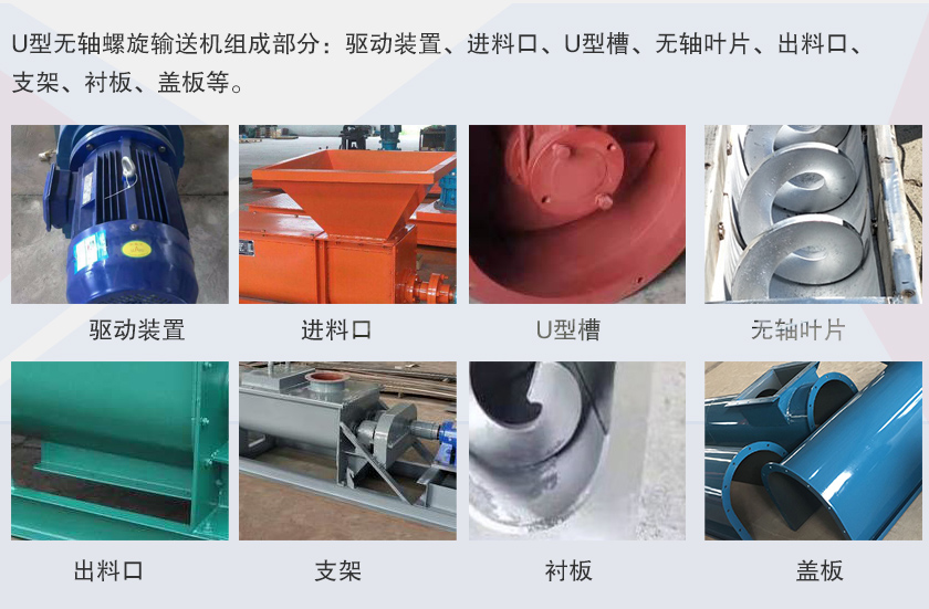 U型無軸螺旋輸送機(jī)組成部分:驅(qū)動(dòng)裝置、進(jìn)料口、U型槽、無軸葉片、出料口、支架、襯板、蓋板等。