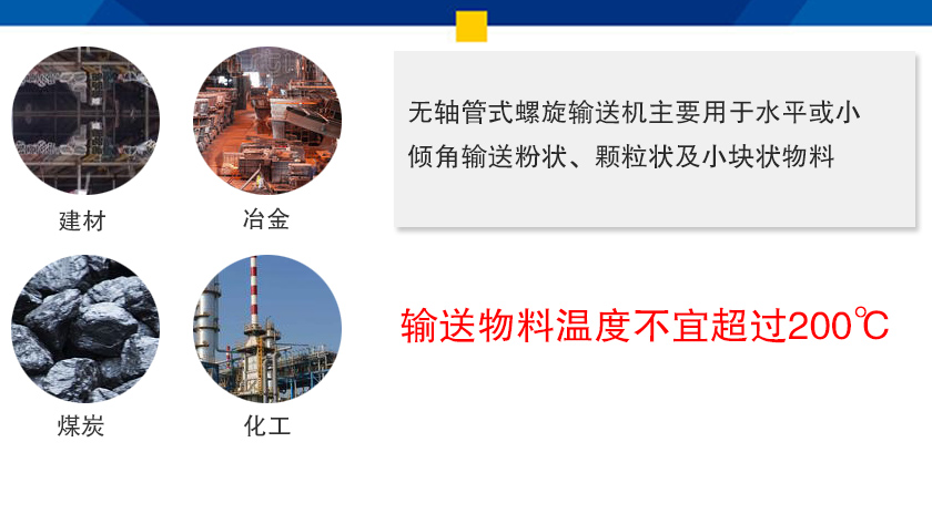 無軸管式螺旋輸送機主要用于水平或小傾角輸送粉狀、顆粒狀及小塊狀物料,輸送物料溫度不宜超過200℃,廣泛應用于建材、冶金、煤炭、化工、污水處理、輕工業(yè)等行業(yè)。
