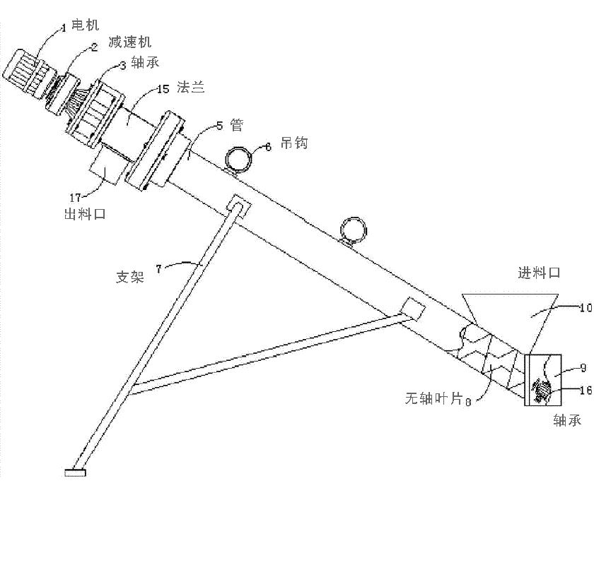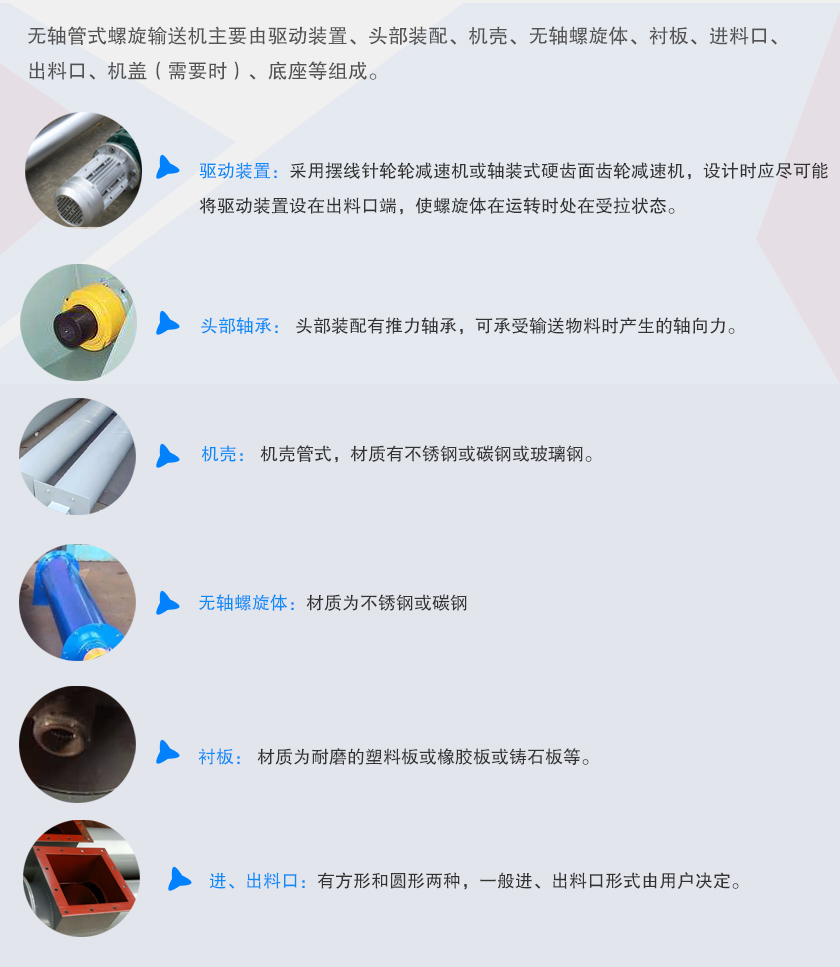 無軸管式螺旋輸送機主要由驅動裝置、頭部裝配、機殼、無軸螺旋體、襯板、進料口、出料口、機蓋(需要時)、底座等組成。