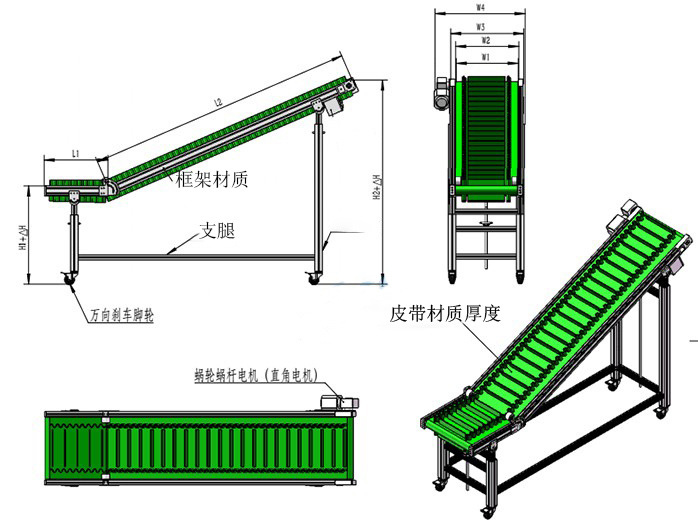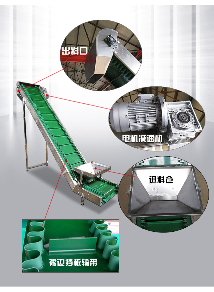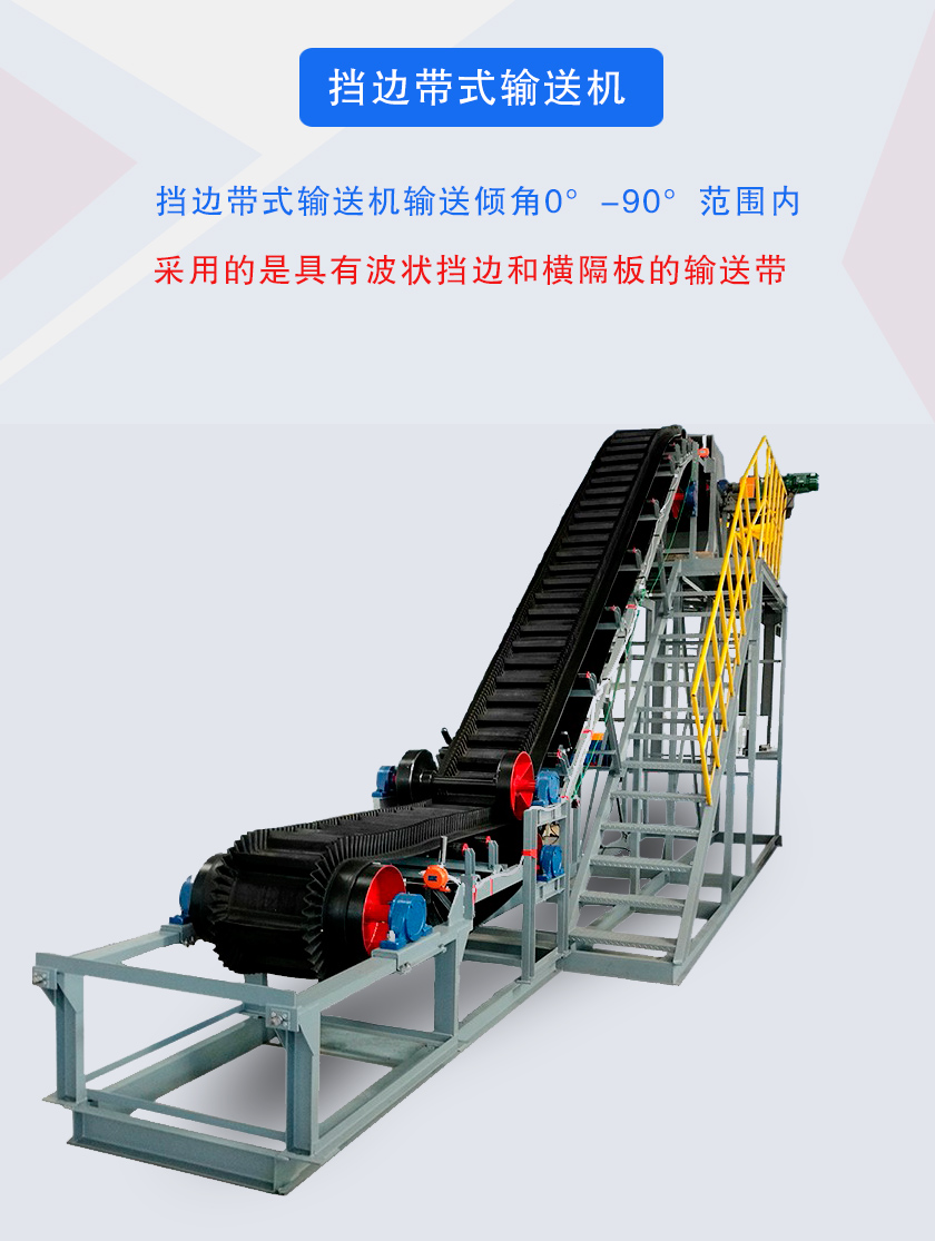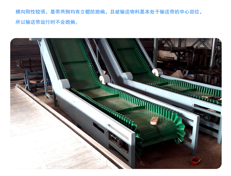 1、波狀擋邊輸送帶和橫隔板設(shè)計,可以防止物料在輸送過程中散落或下滑。