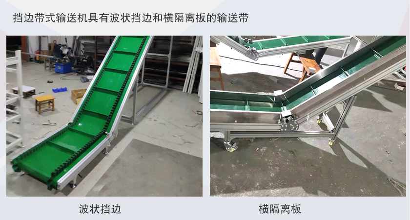 擋邊帶式輸送機(jī)具有波狀擋邊和橫隔離板的輸送帶,適用于大傾角連續(xù)輸送散裝物料,擋邊帶式輸送機(jī)的輸送帶兩則有波狀紋的擋邊,皮帶中間部位有橫隔板,在輸送物料的過程中不容易撒料和下滑,適用于大傾角連續(xù)輸送散狀物料。