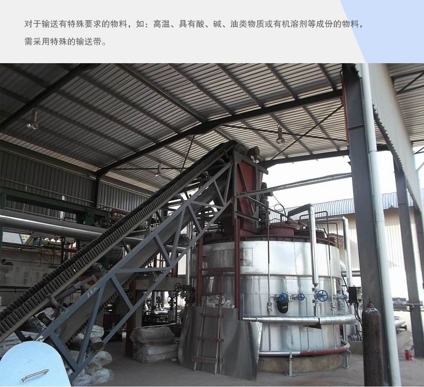 3、對于輸送有特殊要求的物料,如:高溫、具有酸、堿、油類物質(zhì)或有機(jī)溶劑等成份的物料,需采用特殊的輸送帶。