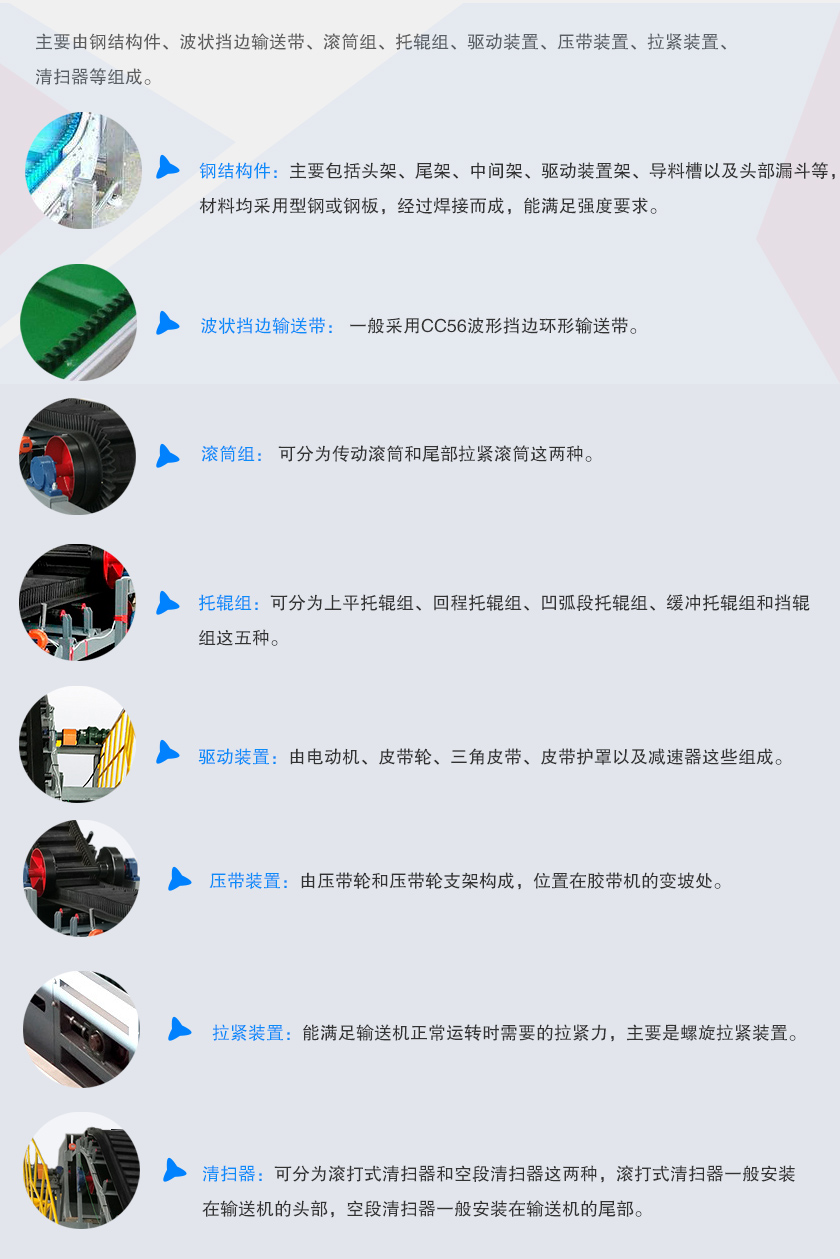 主要由鋼結(jié)構(gòu)件、波狀擋邊輸送帶、滾筒組、托輥組、驅(qū)動裝置、壓帶裝置、拉緊裝置、清掃器等組成。