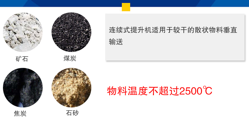 連續(xù)式提升機適用于較干的散狀物料垂直輸送,,如礦石、煤炭、焦炭、水泥、石砂等,可廣泛地應(yīng)用于建材、化工、煤炭、電力、港口運輸?shù)刃袠I(yè)的物料輸送作業(yè)。