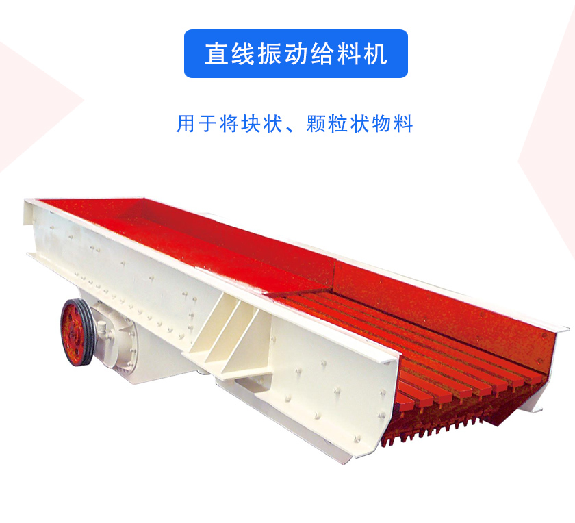 直線(xiàn)振動(dòng)給料機(jī)又叫直線(xiàn)振動(dòng)送料機(jī),簡(jiǎn)稱(chēng)直線(xiàn)給料機(jī),主要用于將塊狀、顆粒狀物料從貯料倉(cāng)中均勻定時(shí)連續(xù)地給到受料裝置中去,砂石破碎生產(chǎn)線(xiàn)中,直線(xiàn)振動(dòng)給料機(jī)可以為破碎機(jī)連續(xù)均勻地喂料,并對(duì)物料進(jìn)行粗篩分.