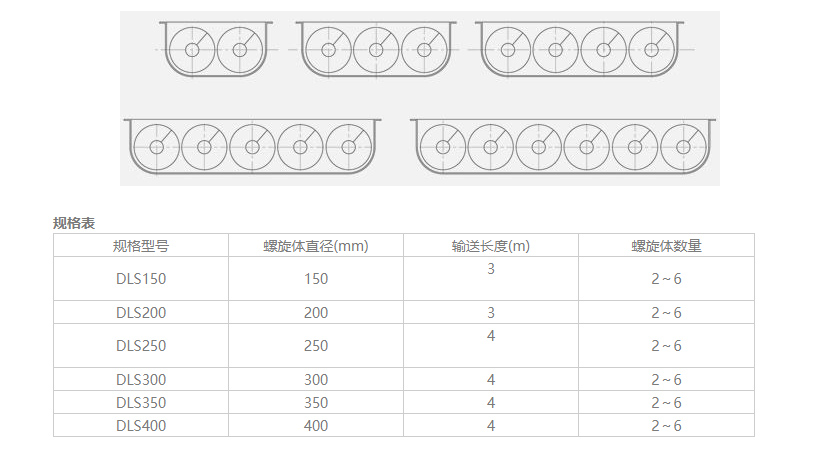 多軸螺旋輸送機(jī)由驅(qū)動裝置、料槽、螺旋葉片、螺旋軸、吊軸承、端部軸承、進(jìn)料口和出料口組成。其驅(qū)動裝置有兩種,一種是電機(jī)、減速機(jī)由彈性聯(lián)軸器連接而成,減速機(jī)與螺旋軸之間常用浮動聯(lián)軸器連接。另一種是直接用配減電機(jī)。在配置螺旋輸送機(jī)時,盡量將驅(qū)動裝置和出料口同時安裝在頭節(jié)。