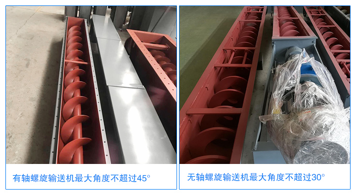 有軸螺旋輸送機(jī)角度不超過45°,有軸螺旋輸送機(jī)因機(jī)體有軸分布,輸送物料相對無軸少。