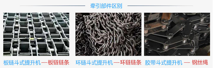 環(huán)鏈斗式提升機牽引件選用優(yōu)質(zhì)合金鋼高度圓環(huán)鏈;板鏈斗式提升機的鏈條是優(yōu)質(zhì)合金鋼高強度板式鏈條;膠帶斗式提升機采用高強度的鋼絲繩作為牽引部件。