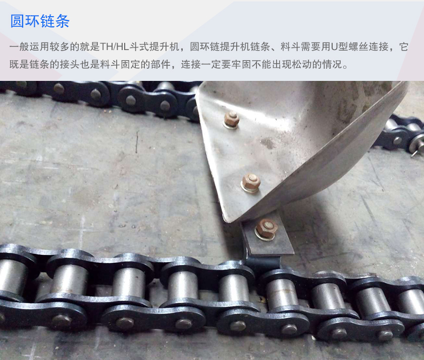 斗式提升機(jī)圓環(huán)鏈條一般運(yùn)用較多的就是TH斗式提升機(jī),圓環(huán)鏈提升機(jī)鏈條、料斗需要用U型螺絲連接,它既是鏈條的接頭也是料斗固定的部件,連接一定要牢固不能出現(xiàn)松動(dòng)的情況。