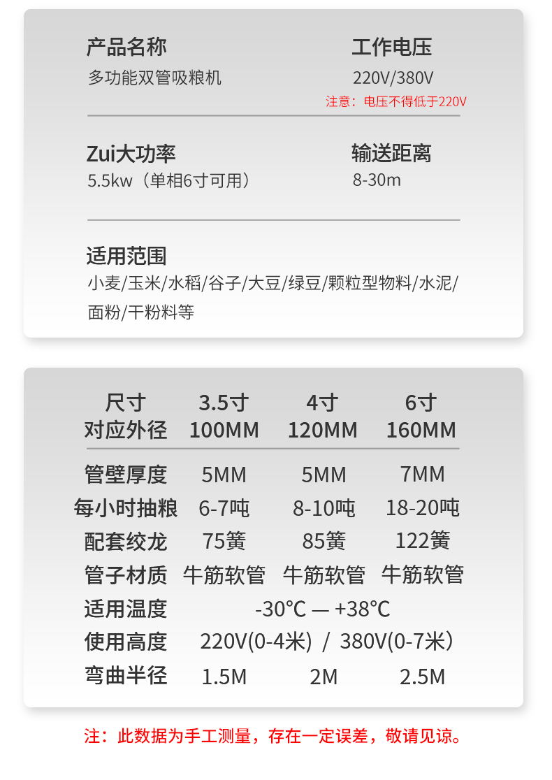 機(jī)器7m以下可使用3kw兩相/3KW三相銅線電機(jī),8m-12m之間可使用4kw三相電銅線電機(jī),一般情況下,220V垂直高度3米,380V垂直高度4米(數(shù)據(jù)一般以糧食為準(zhǔn))