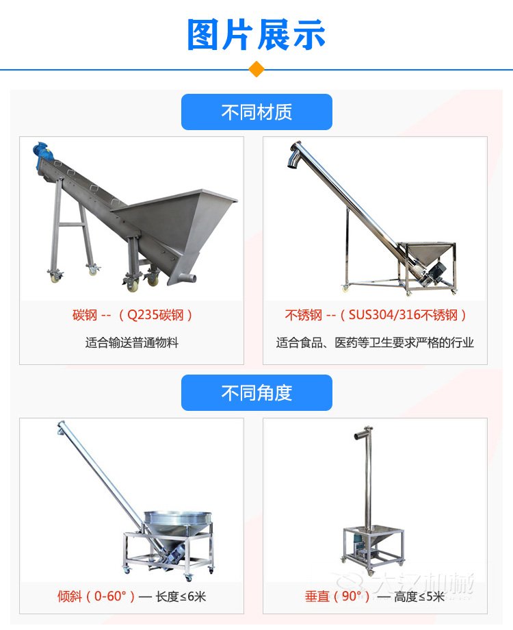 2、0-60°大傾角輸送,能同時(shí)輸送和提升物料,適合與料斗、料倉(cāng)或筒倉(cāng)連接。