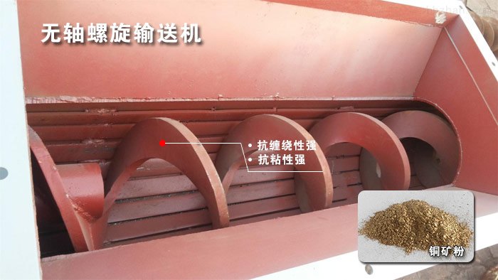 無軸螺旋輸送機采用了無中心軸設(shè)計,與傳統(tǒng)有軸螺旋輸送機相比,利用具有一定柔性的整體鋼制螺旋推送物料,因而具有以下突出優(yōu)點:抗纏繞性強、抗粘性強。