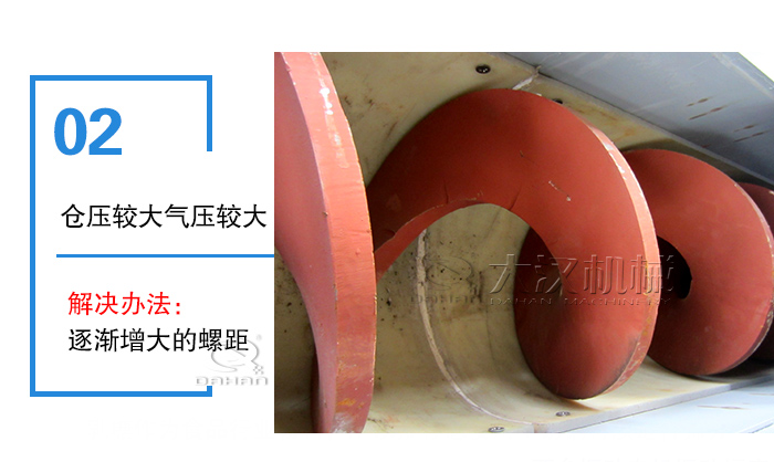 沖料原因2:倉(cāng)壓較大氣壓較大,粉料沿賺旋葉片螺旋方向沖向出料口,使得喂料機(jī)在喂料處被物料“淹沒(méi)”。