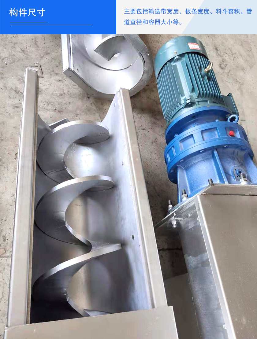 主要包括輸送帶寬度、板條寬度、料斗容積、管道直徑和容器大小等。這些構件尺寸都直接影響螺旋給料機的輸送能力。如螺旋輸送機管徑越大,效率也就越高。當然,并不一定就是輸送機本身才能影響效率,物料的各種性質也都會對效率有所影響。
