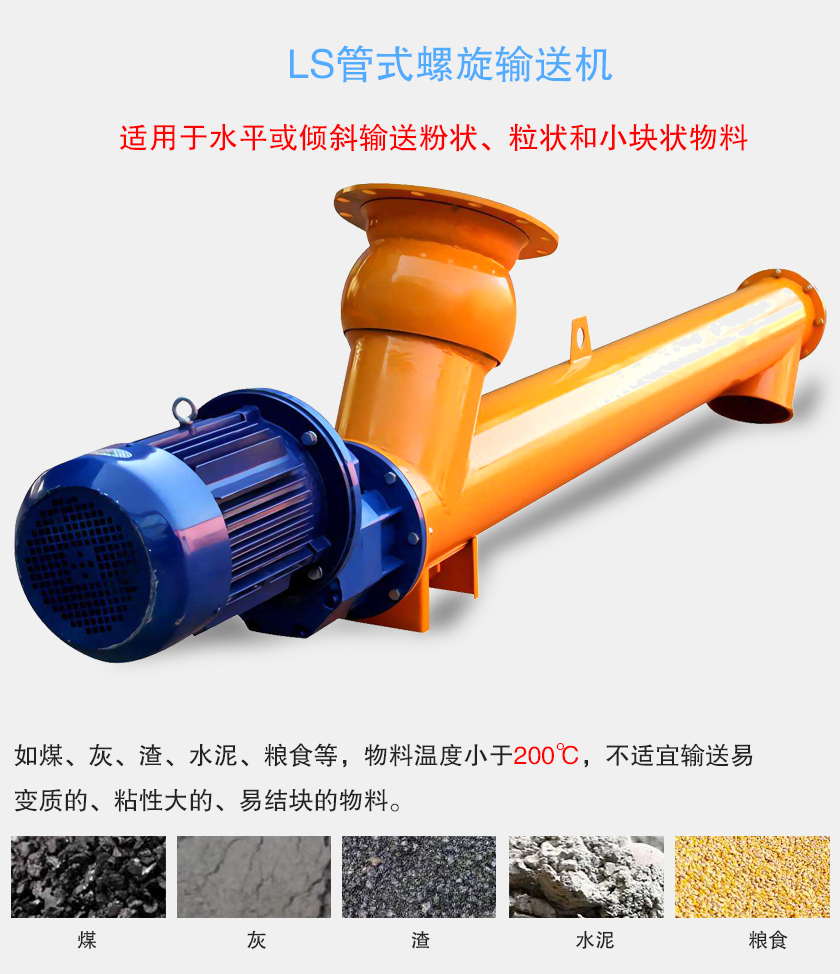 LS管式螺旋輸送機(jī)適用于水平或傾斜輸送粉狀、粒狀和小塊狀物料,如煤、灰、渣、水泥、糧食等,物料溫度小于200℃,不適宜輸送易變質(zhì)的、粘性大的、易結(jié)塊的物料。