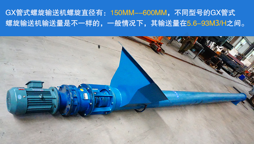 GX管式螺旋輸送機(jī)螺旋直徑有:150mm,200mm,250mm,300mm,400mm,500mm,600mm,不同型號(hào)的GX管式螺旋輸送機(jī)輸送量是不一樣的,一般情況下,其輸送量在5.6-93m³/h之間。