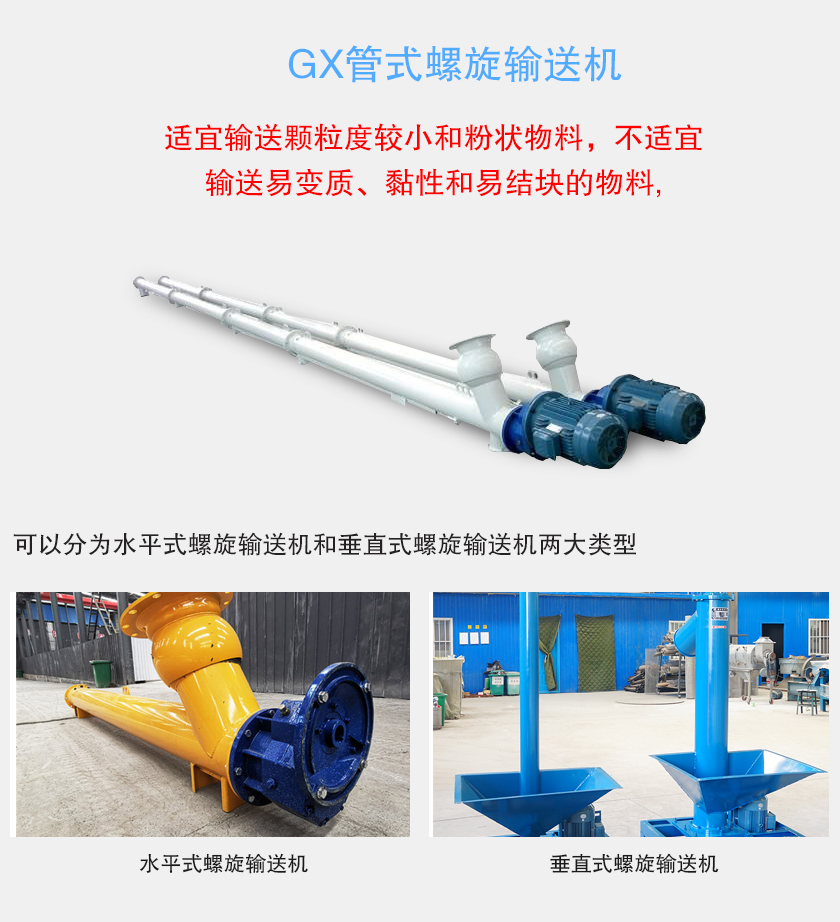 GX型管式螺旋輸送機(jī)是按照J(rèn)B/T679-95《螺旋輸送機(jī)》標(biāo)準(zhǔn)設(shè)計(jì)制造,是LS型螺旋輸送機(jī)的換代產(chǎn)品,適宜輸送顆粒度較小和粉狀物料,不適宜輸送易變質(zhì)、黏性和易結(jié)塊的物料,可以分為水平式螺旋輸送機(jī)和垂直式螺旋輸送機(jī)兩大類型。