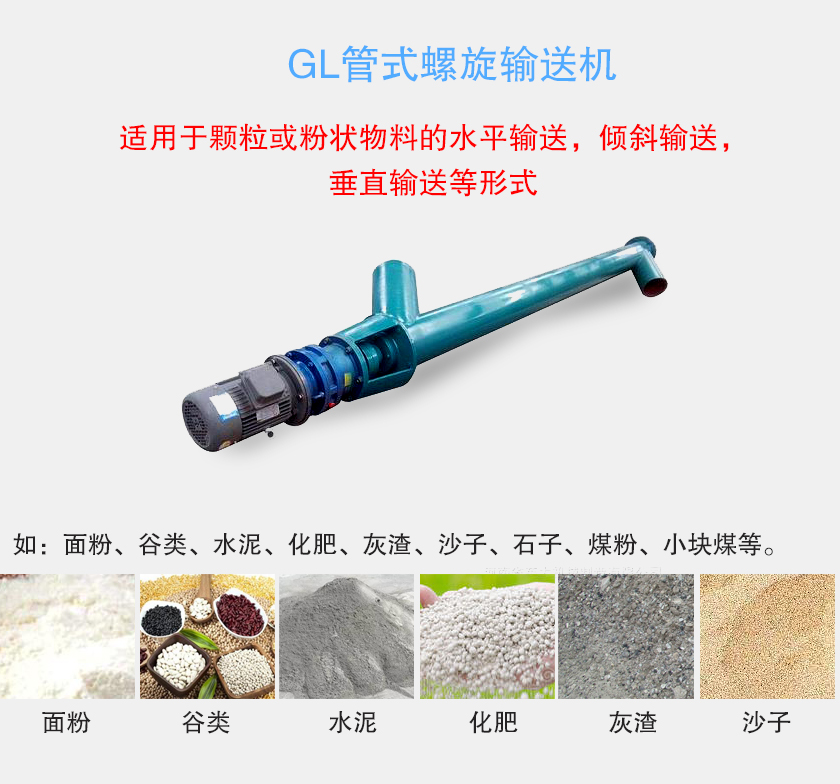 GL管式螺旋輸送機(jī)適用于顆?;蚍蹱钗锪系乃捷斔停瑑A斜輸送,垂直輸送等形式,如:面粉、谷類、水泥、化肥、灰渣、沙子、石子、煤粉、小塊煤等。