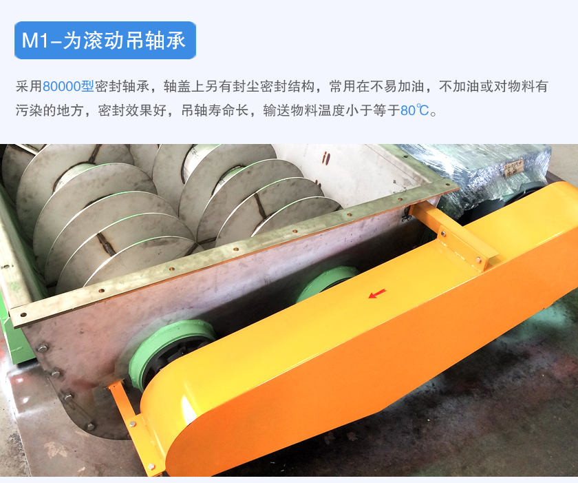 采用80000型密封軸承,軸蓋上另有封塵密封結(jié)構(gòu),常用在不易加油,不加油或?qū)ξ锪嫌形廴镜牡胤?,密封效果好,吊軸壽命長,輸送物料溫度小于等于80℃。