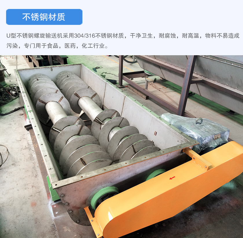 U型不銹鋼螺旋輸送機(jī)采用304/316不銹鋼材質(zhì),干凈衛(wèi)生,耐腐蝕,耐高溫,物料不易造成污染,專門用于食品,醫(yī)藥,化工行業(yè)。