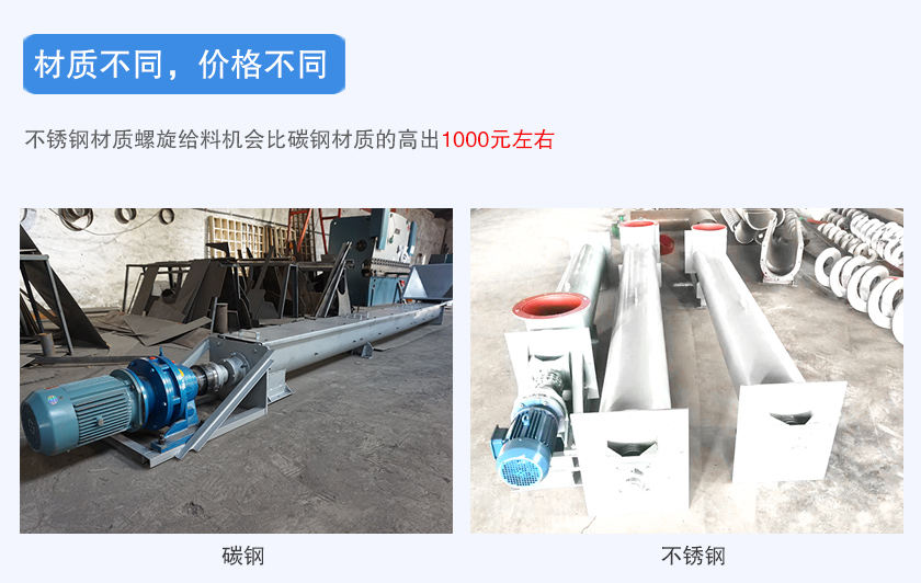 螺旋給料機可以分為碳鋼和不銹鋼材質兩種,碳鋼螺旋給料機適合普通物料輸送,不銹鋼螺旋給料機主要用于輸送機一些腐蝕性、高溫物料,不銹鋼材質螺旋給料機會比碳鋼材質的高出1000元左右。